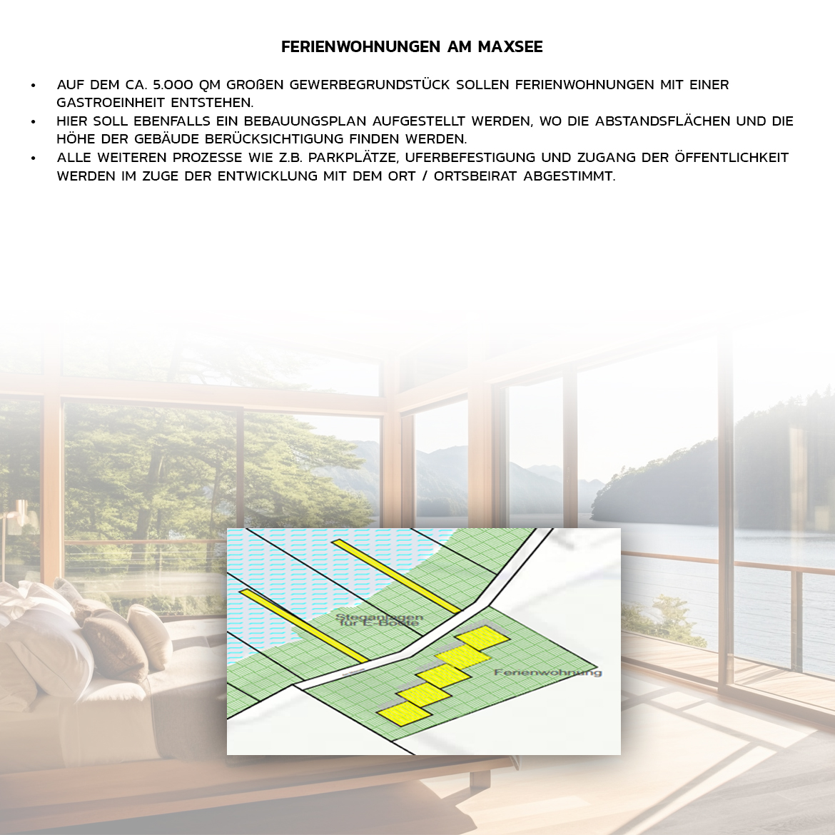 Auf dem ca. 5.000 qm großen Grundstück sollen Ferienwohnungen mit einer Gastroeinheit entstehen.