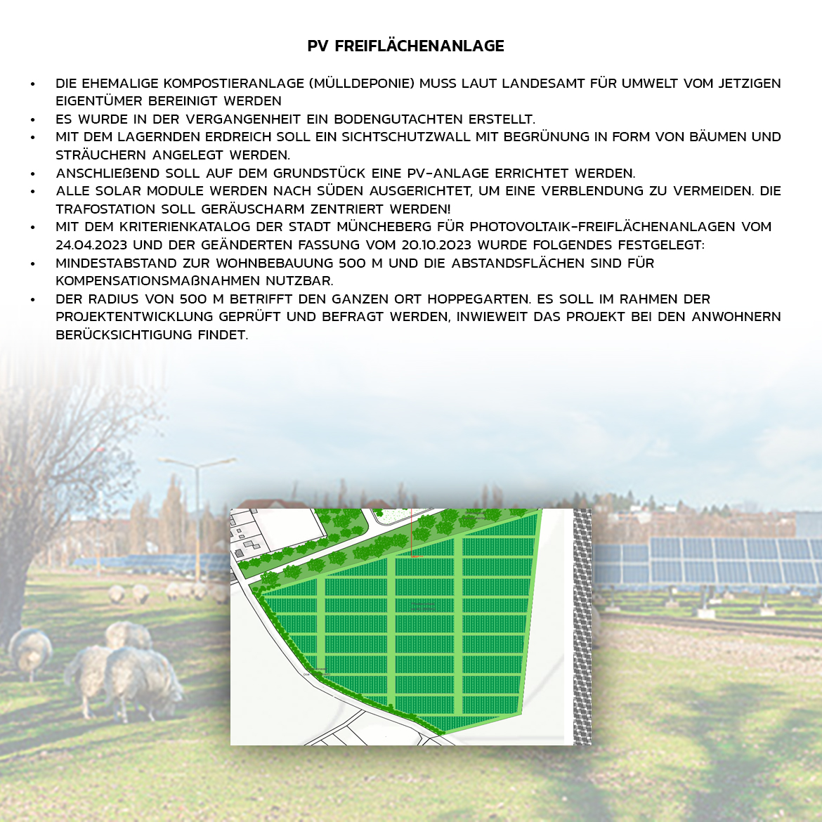 Die ehemalige Kompostieranlage (Mülldeponie) muss laut LfU vom jetzigen Eigentümer bereinigt werden! Berechnungen zufolge liegen auf den ca. 160.000 m² großen Grundstück ca. 35.000 Tonnen Boden mit Schutt durchsetzt. Es wurde in der Vergangenheit ein Bodengutachten erstellt, was einen Verbleib des überwiegenden Erdreichs auf dem Grundstück nicht ausschließt. Dazu sind weitere Gutachten während der Projektentwicklung geplant, um sicher zu stellen das kein kontaminiertes Erdreich auf dem Grundstück verweilt. Mit dem lagernden Erdreich ist geplant, Sichtschutzwalle mit Begrünung in Form von Bäumen und Sträuchern anzulegen. Anschließend soll auf dem Grundstück eine PV-Anlage errichtet werden. Somit kann die Fläche rekultiviert werden und der Boden kann sich erholen. Alle Solar Module werden nach Süden ausgerichtet, um eine Verblendung zu vermeiden. Die Trafostation soll geräuscharm zentriert werden!
