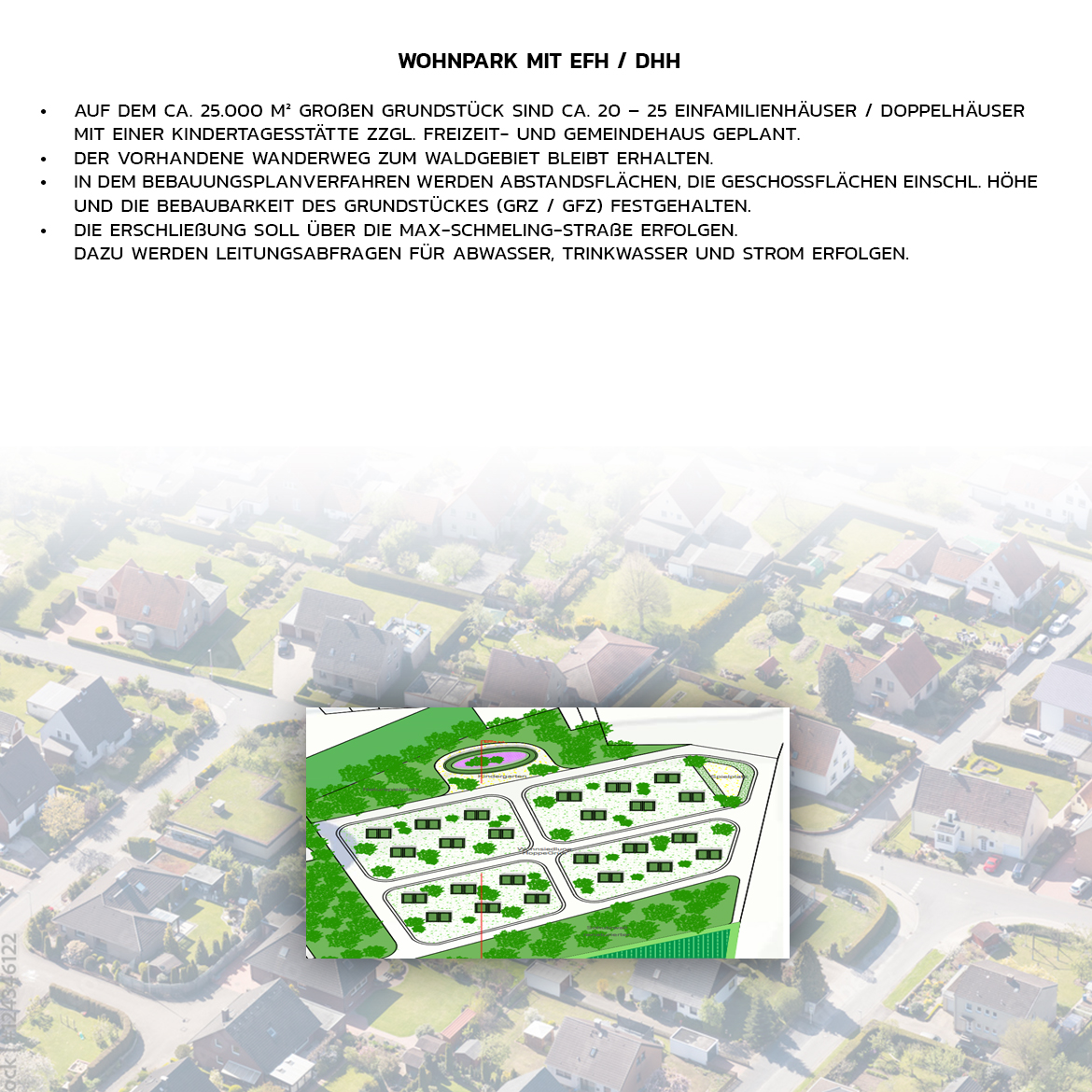 Auf dem ca. 25.000 m² großen Grundstück sind ca. 20 – 25 Einfamilienhäuser mit einer Kindertagesstätte zzgl. Freizeitraum geplant. Die Erschließung erfolgt über die Max-Schmeling-Straße. Der vorhandene Wanderweg zum Waldgebiet bleibt erhalten.